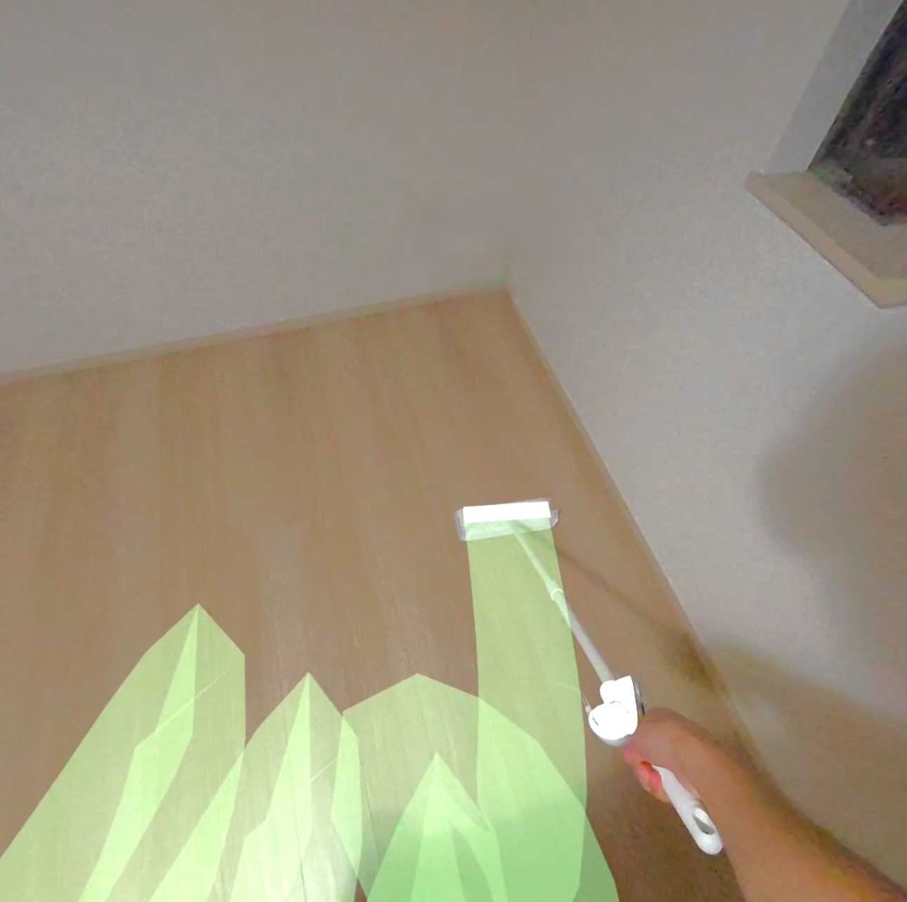 MRゴーグルを装着して掃除機をかけると、掃除した場所(軌跡)がリアルタイムで緑色に塗りつぶされていきます。「どこを掃除したか」「どこに塗り残しがあるか」が一目瞭然になる体験です。